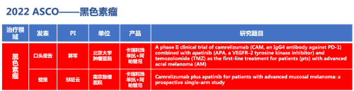 黑色素瘤领域的2篇研究摘要,采用PG医药自主研发的PD-1抑制剂卡瑞利珠单抗(艾瑞卡)联合阿帕替尼(艾坦)(“双艾”组合)的免疫联合抗血管(或再联合化疗)的治疗策略。